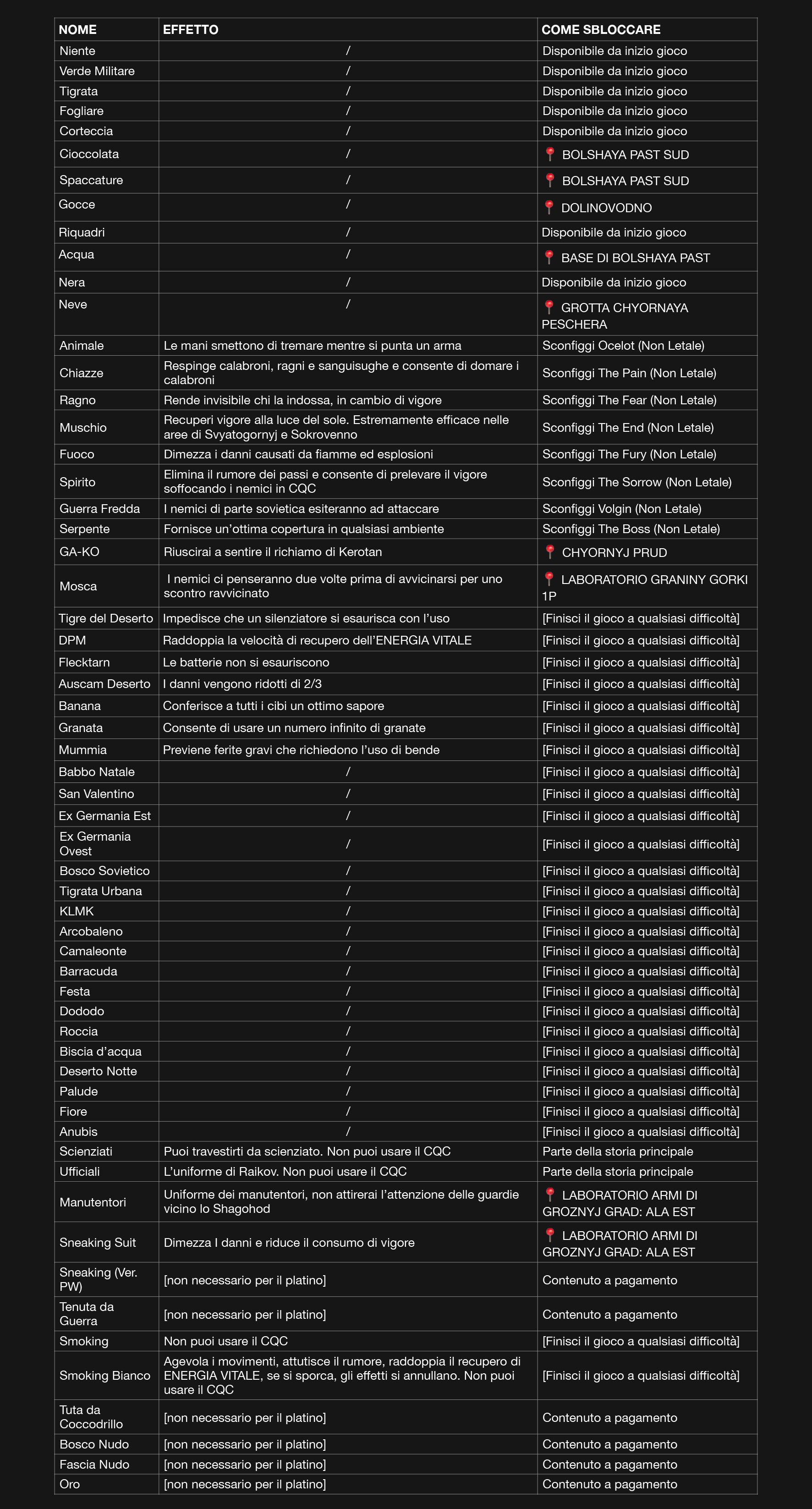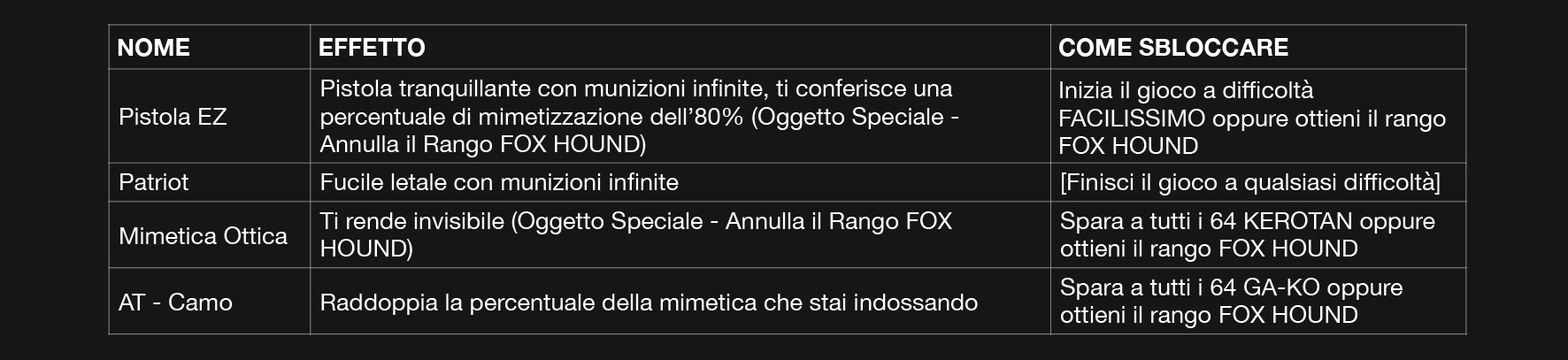 Alcuni oggetti del new game+ (come la AT - Camo o Uniforme - Tigre del Deserto : Impedisce che un silenziatore si esaurisca con l’uso)