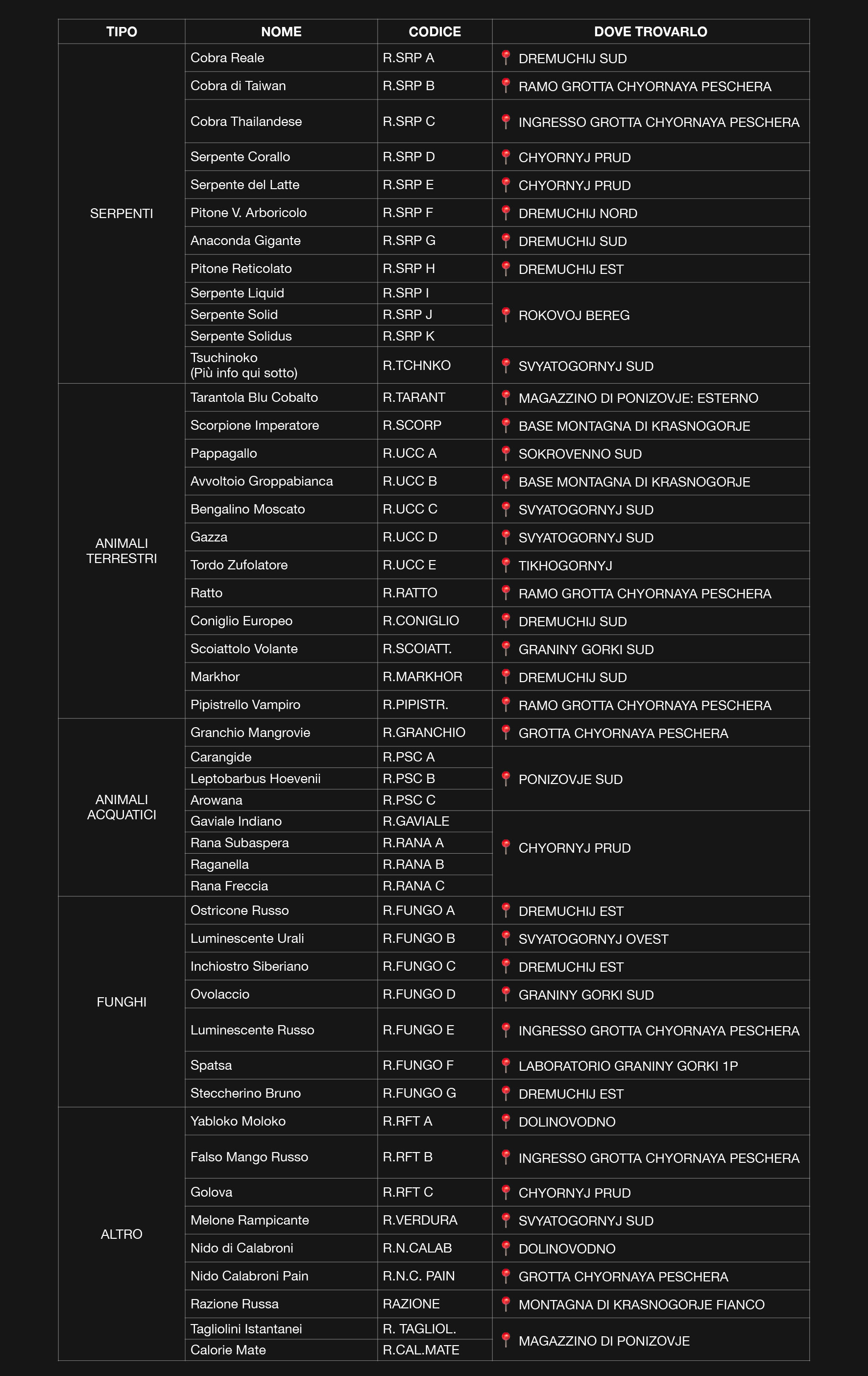 Questa tabella elenca tutti gli oggetti alimentari presenti nel gioco ed i loro effetti. Include le posizioni in cui li ho raccolti durante la partita ma possono essere trovati anche in altri luoghi. Sono elencati nello stesso ordine mostrato nel catalogo CIBO del menu principale.